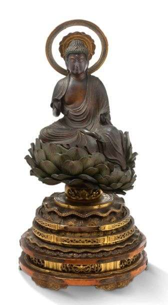 Sujet en bois laqué brun, représentant le Bouddha assis en lalitâsana sur un lotus aux pétales laqués vert et or, les deux mains en vitarka mudra (geste de l'argumentation), la tête nimbée d'une auréole lotiforme.