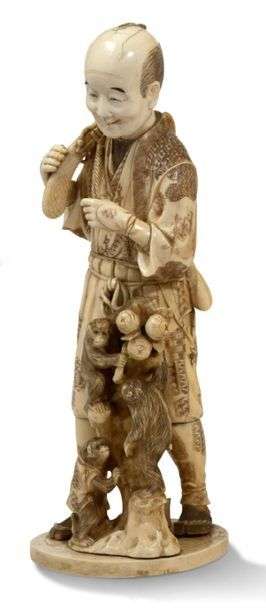 Okimono en ivoire représentant un sarumawashi avec ses trois singes tenant des kakis.