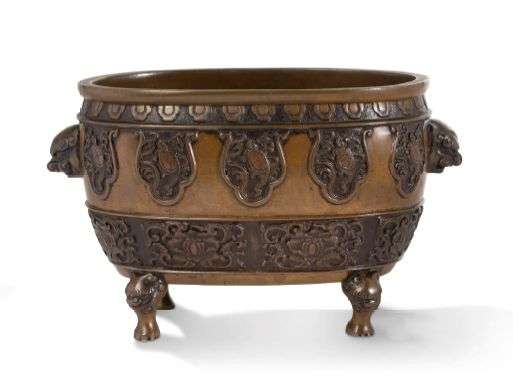 Brûle-parfum en bronze, de forme ovale, reposant sur quatre pieds à têtes de lion et pattes griffues, orné en registres de motifs géométriques, médaillons floriformes avec tortues minogames, fleurs de lotus et rinceaux.