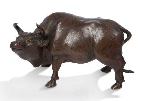 Okimono en bronze de patine brune représentant un buffle d'eau à l'arrêt, la tête légèrement vers la gauche, le pelage finement ciselé. Signé sur le ventre.