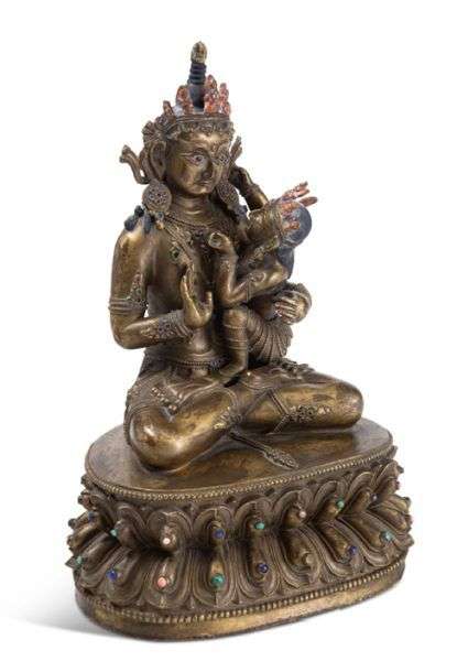 Groupe en bronze avec traces de dorures, rehaussé de cabochons de couleurs, représentant un boddhisattva, assis en padmasana sur un double lotus, la main droite en abahaya mudra (absence de crainte), la gauche enlaçant sa shakti, les deux couronnés de têtes de citipati, rehaussées de rouge.