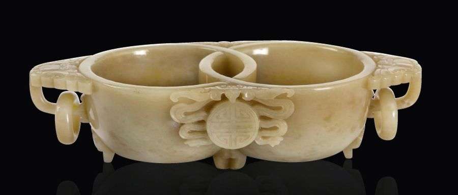 Godet double-coupe en jade beige, un caractère shou surmonté d'une chauvesouris sur chaque côté, les anses en forme de chauves-souris soutenant deux anneaux mobiles.