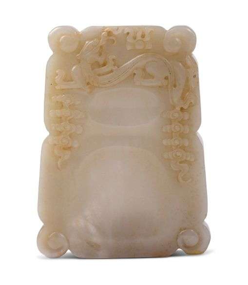 Pierre à encre en jade blanc légèrement céladon, sculpté en léger relief d'un dragon et de nuages stylisés.