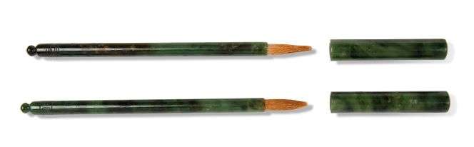 Paire de pinceaux en jade épinard, l'extrémité orné d'un bouton et frise de grecques.