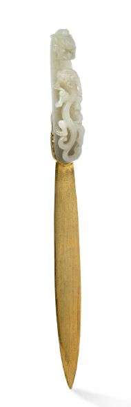 Fibule en jade céladon, sculpté d'un chilong en ronde bosse, l'extrémité de la fibule à tête de dragon. Monté en coupe papier avec lame en bronze.