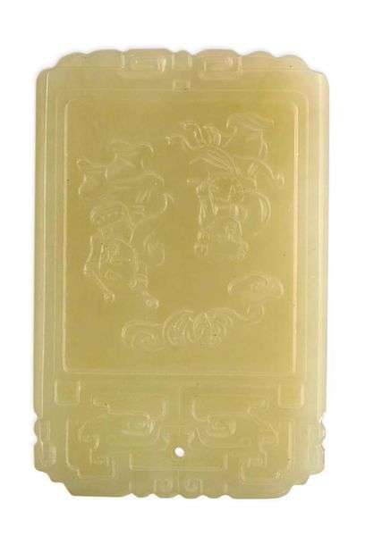 Pendentif de forme rectangulaire en jade blanc céladonné, sculpté en léger relief des frères Hoho et d'un poème calligraphié, surmonté d'une chauve-souris. La prise formée de deux dragons stylisés affrontés.