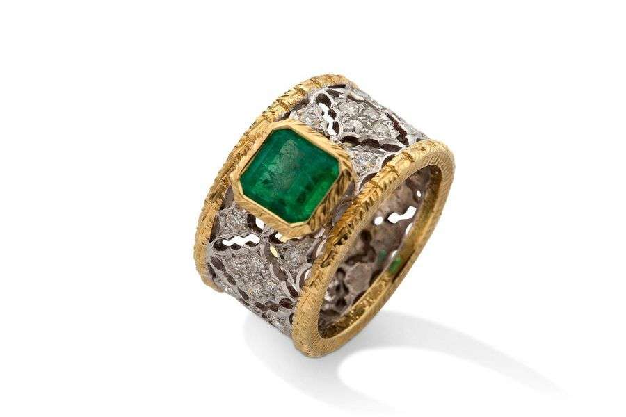 bague ajourÈe, Èmeraude, diamants, or 18K (750)