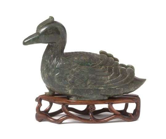 Boîte en amphibole vert épinard, sculptée en forme de canard mandarin.