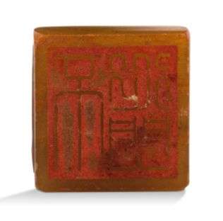 Petit cachet bouddhique en stéatite de couleur miel, de forme pyramidale, la base portant une maxime bouddhique.