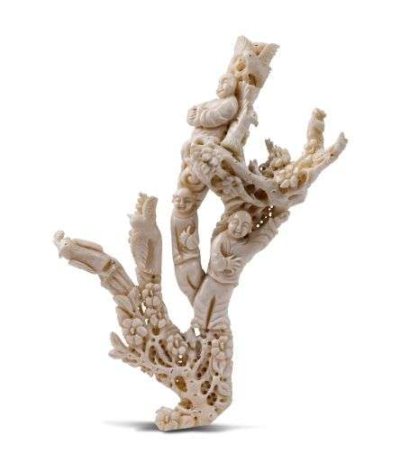 Groupe en corail blanc à trois branches sculptées de personnages, arbre fleuri et oiseaux.
