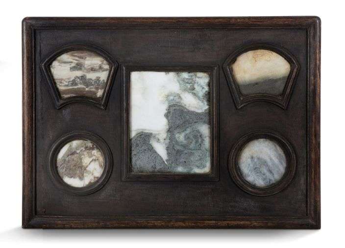 Ensemble de cinq pierres de rêve de forme quadrangulaire, circulaires ou évoquant des éventails, sertis dans un panneau en bois sombre.