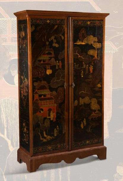 Grande armoire en laque du Shanxi, ouvrant à deux portes finement décorées en polychromie sur fond noir, de lettrés évoluant aux abords de pavillons entourés de rochers évoquant le Tao, parmi des pins de longévité et saules-pleureurs, les côtés ornés de paysage et motifs floraux.