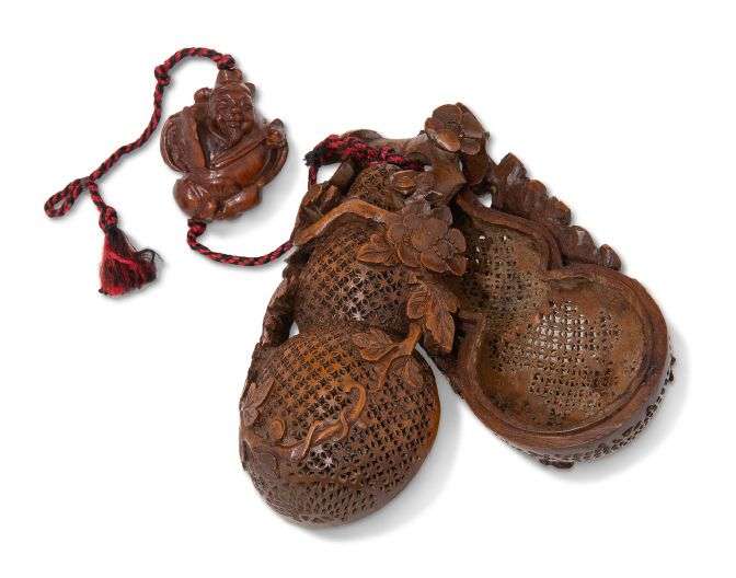 Diffuseur à parfum en bois, reprenant la forme d'une calebasse ajourée de fleurettes, prise dans des branches de prunus en fleurs, lié à un sujet en bois représentant le dieu de l'abondance et son éventail.
