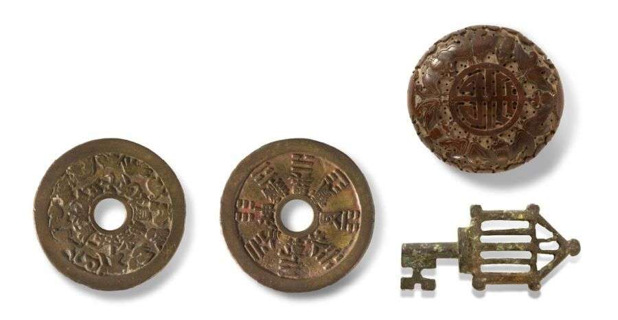 Lot de trois objets, dont un pendentif en bois ou corne sculpté des Wufu | une pièce ornée des animaux du zodiaques et des bagua | et une clef en bronze.