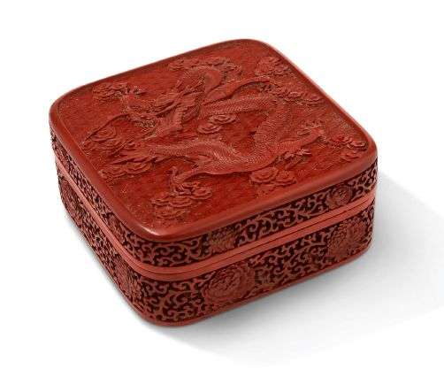 Boîte quadrangulaire en laque de cinabre, le couvercle à décor sculpté d'un dragon parmi des nuages, les bordures à motifs de lotus, pivoines et rinceaux.