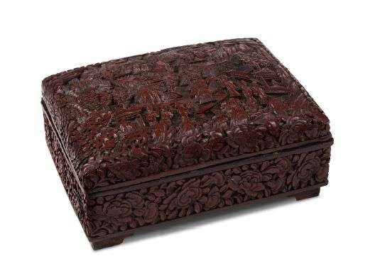 Coffret à couvercle à charnière en laque rouge foncé sculpté de paysages animés de personnages et pavillons, le pourtour orné de motifs floraux.