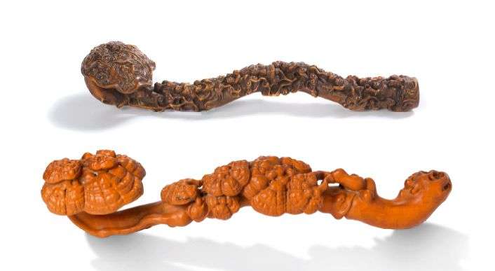 Deux petits sceptres ruyi reprenant la forme d'un lingzhi en bois finement sculpté de divinités parmi des lingzhi, la tête ornée de divinités et d'un dragon parmi des lingzhi pour l'un. L'autre en bois laqué, reprenant la forme de lingzhi.