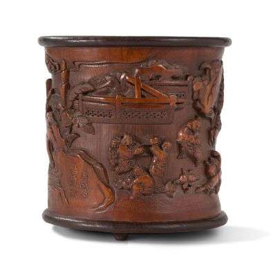 Porte-pinceaux bitong en bambou, à décor sculpté en léger relief de jeux d'enfants parmi des pêchers, bambous et rochers.