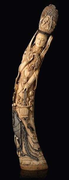 Défense en ivoire sculptée, teintée et rehaussée de brun, représentant la déesse Guanyin tenant un panier de lotus et une branche de feuillages, un phénix à ses pieds et une figure du Bouddha dans sa haute tiare.