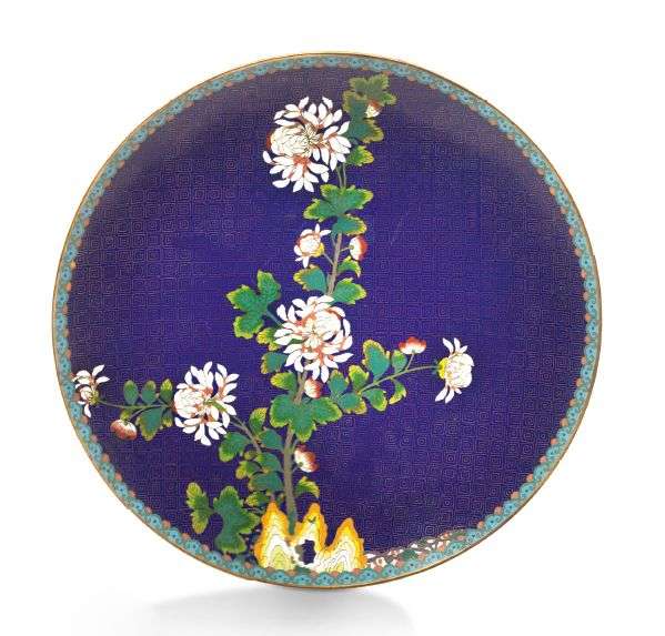 Grande coupe en émaux cloisonnés sur cuivre, à décor de chrysantèmes sur un fond bleu nuit orné de spirales carrées.