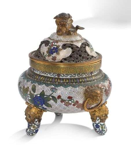 Brûle-parfum tripode en bronze doré, cuivre et émaux cloisonnés à décor floral polychrome sur un fond blanc pavé de losanges, le couvercle ajouré surmonté d'un chien de Fô, les pieds crachés par des têtes zoomorphes. Sur son socle en bois. Marque incisée à l'intérieur du couvercle : fait par "Lao Tian Li".