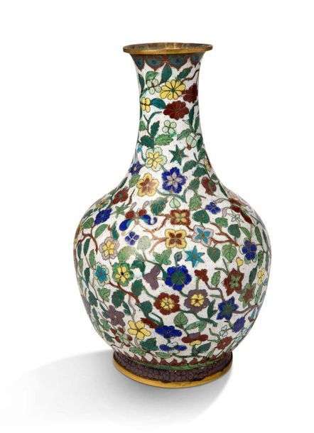 Vase bouteille à long col en bronze et émaux cloisonnés à décor de fleurs d'été et de papillons polychromes sur un fond blanc.