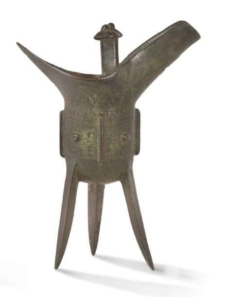 Vase jue en bronze de style archaïsant à décor de masques de taotie sur fond de leiwen et de cigales stylisées.