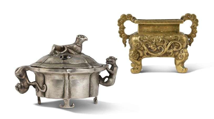Lot de deux petits brûle-parfums, l'un quadrangulaire sur quatre pieds, en bronze doré, à décor en léger relief de dragons parmi des nuages, deux anses en forme de nuages stylisés, l'ouverture soulignée d'une frise de grecques | l'autre floriforme couvert en bronze argenté, deux félins formant anses, la prise du couvercle à décor d'une chimère, marque apocryphe Qianlong.