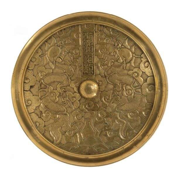 Grand miroir en bronze de patine dorée à décor en léger relief de deux dragons à cinq griffes poursuivant la perle sacrée parmi des nuages stylisés.