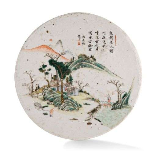 Plaque circulaire en porcelaine, à décor en émaux de la famille verte d'un paysage lacustre accompagné d'un poème, signé Tang Yi Shun.