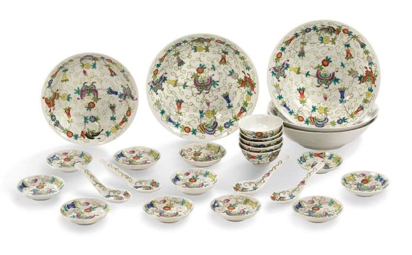 Ensemble de 70 pièces en porcelaine et émaux polychromes, à décor de papillons et fleurs, composant un service, dont une terrine couverte, un plat, quatre assiettes creuses, deux grandes coupes, quatre grandes assiettes, quatre assiettes, neuf soucoupes, trois bols, onze petites soucoupes, huit petites coupelles, dix petites coupes, deux grandes cuillères et onze petites cuillères.