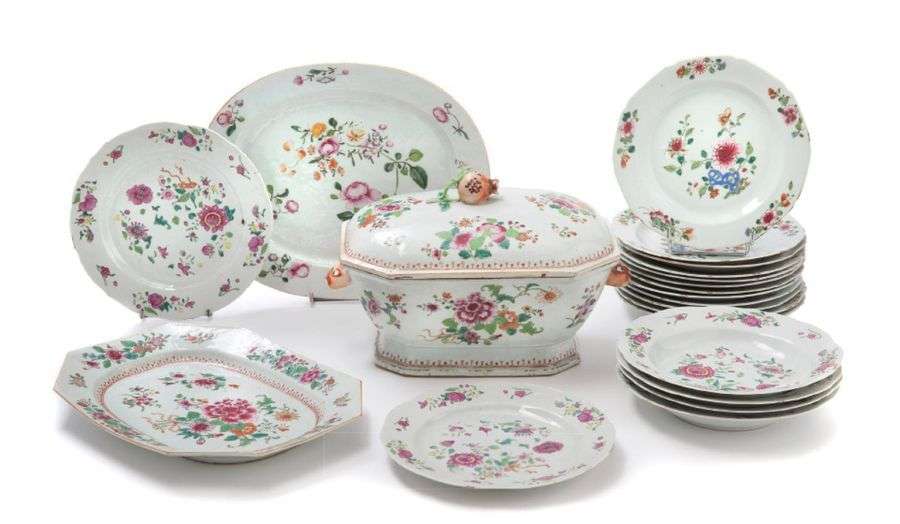 Service en porcelaine et émaux famille rose comprenant douze assiettes à décor central de chrysanthèmes | une soupière et son présentoir, les prises en forme de têtes de lapin et de grenade.