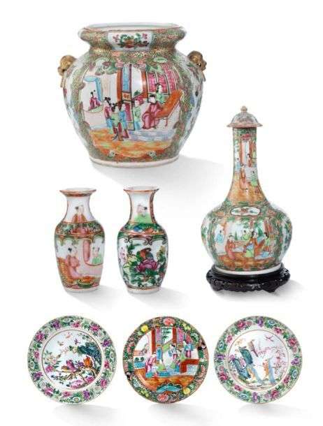 Canton en porcelaine et émaux famille rose et trois assiettes en porcelaine et émaux famille rose dont deux à décor d'oiseaux, fleurs et personnages dans des palais.