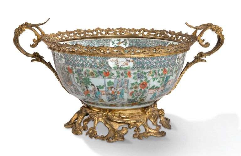 Monture européenne en bronze doré autour du bord et du pied, agrémentée de deux grandes anses.