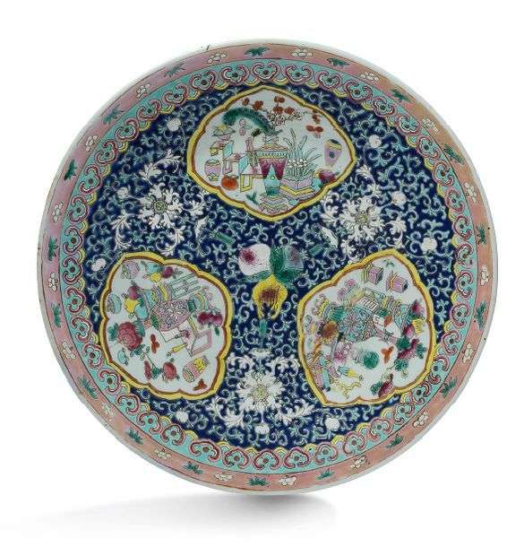 Grand plat en porcelaine et émaux de la famille rose, à décor sur fond bleu en médaillons d'objets mobiliers et de compositions florales, autour d'une pêche, grenade et citron digité «main de Bouddha» parmi des lotus et rinceaux feuillagés.