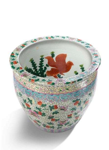 Grande vasque à poissons en porcelaine de la famille rose, à décor à l'extérieur de papillons et melons parmi des rinceaux feuillagés, symbolisant l'amour fidèle | l'intérieur orné de cinq poissons rouges parmi des plantes aquatiques.