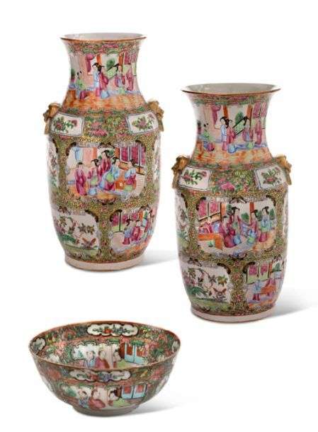 Ensemble de trois porcelaines et émaux de famille rose comprenant deux vases formant pendant à décor similaire de réserves animées de personnages, et fleurs et oiseaux sur fond doré orné de papillons et fleurs.
