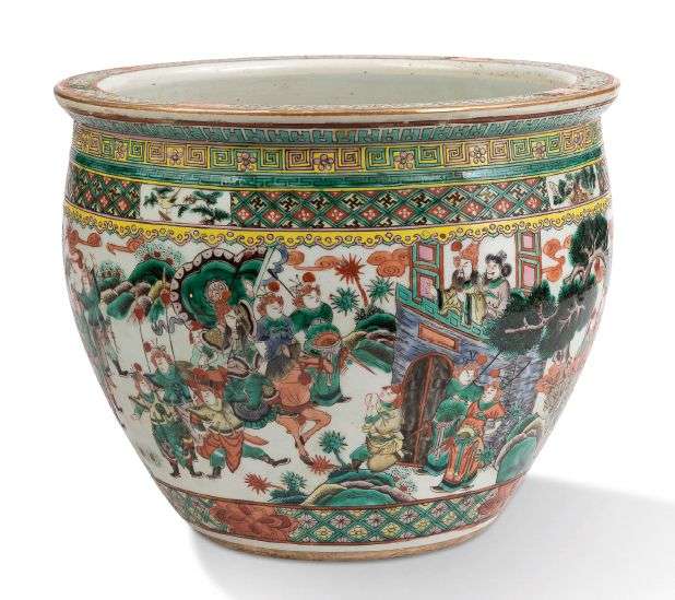 Vasque à poissons en porcelaine et émaux de style famille verte, à décor de guerriers et dignitaires dans des pavillons et remparts, l'ouverture et la base soulignés de motifs géométriques et stylisés, l'intérieur orné de poissons parmi des plantes aquatiques.