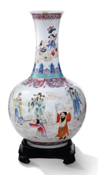 Vase bouteille à long col, en porcelaine et émaux de la famille rose, à décor des huit immortels (Baxian), le col orné des frères