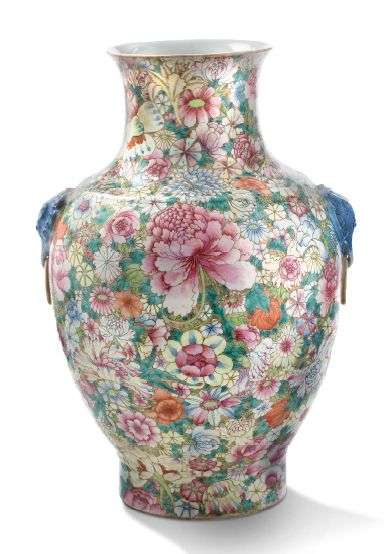 Vase balustre en porcelaine et émaux de la famille rose, entièrement orné d'un décor dit "mille fleurs", l'épaule rehaussée de deux têtes d'éléphant en relief, émaillées bleu, formant les anses.