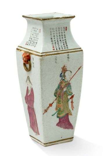 Vase quadrangulaire de type wu shuang pu en porcelaine et émaux de la famille rose à décor de personnages historiques ou légendaires, identifiés par des inscriptions et des poèmes calligraphiés. Deux anses en forme de tête de lion complètent le décor.