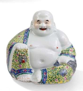 Sujet en porcelaine et émaux polychromes, représentant Milefo souriant, assis en lalitasana, un rosaire dans la main droite, son sac aux richesses à ses côtés.