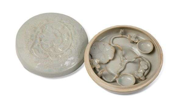 Boîte couverte en céramique émaillée de type Qingbai, ouvrant sur un étang miniature avec lotus et petits réceptacles, le couvercle à décor moulé d'une fleur de lotus.