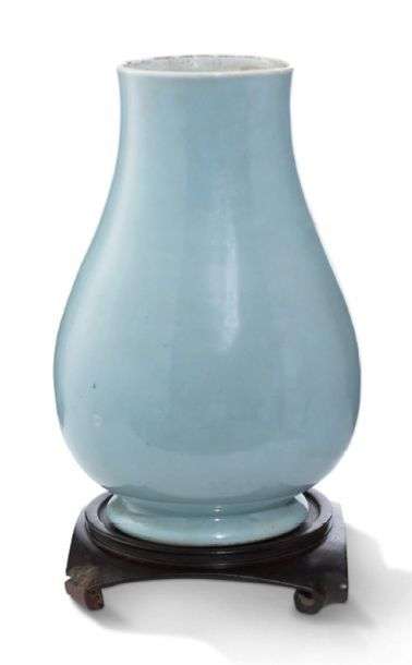 Vase panse légèrement bombée et col large en porcelaine émaillée monochrome bleu lavande. Porte une marque apocryphe