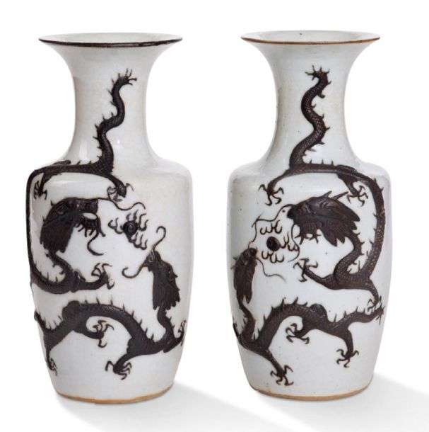 Paire de vases balustres en porcelaine, craquelée beige, à décor en léger relief en biscuit brun, de deux dragons poursuivant la perle sacrée.