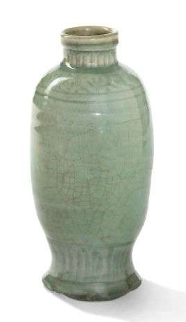 Vase ovoïde à petit col droit, en grès émaillé céladon craquelé, le col, l'épaule et le pourtour de la base à décor de motifs géométriques et stylisés.