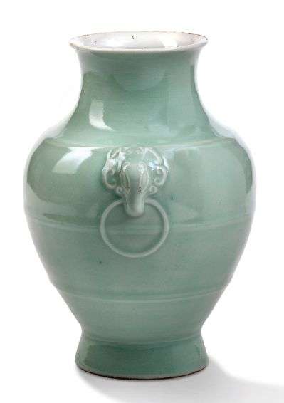 Vase sur petit pied évasé en porcelaine à couverte céladon, la large panse soulignée de trois filets horizontaux en léger relief, de masques zoomorphes tenant des anneaux rehaussant l'épaule.