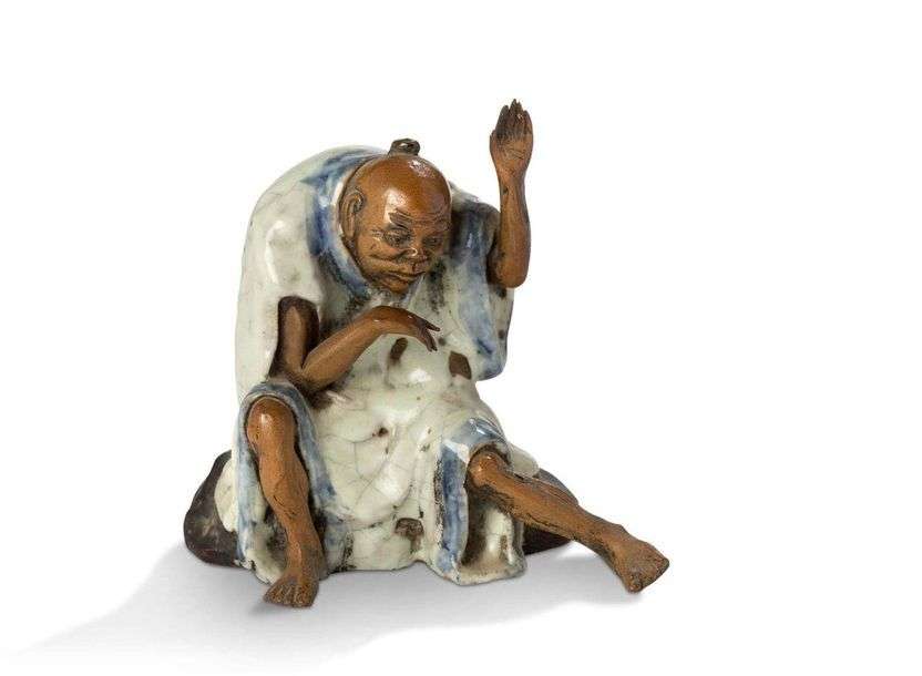 Sujet en grès émaillé, représentant un homme assis levant sa main gauche pour écraser un moustique sur sa jambe.