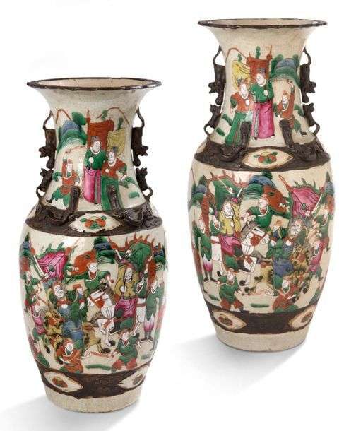 Paire de vases en grès de Nankin à décor polycrhome sur fond craquelé beige de scènes de bataille, l'épaule et la base soulignées de biscuit brun avec félins et chilong en relief. Marque sur la base.