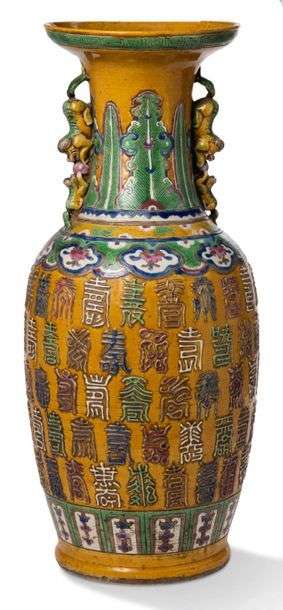 Grand vase en porcelaine et émaux polychromes, à décor sur fond jaune de caractères calligraphiés, le col orné de frises de ruyi et feuilles de bananiers, et deux anses en formes de chien de Fô.